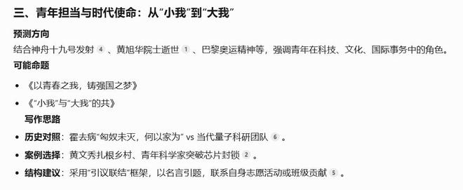 某种程度上来说,在语文、政 治等偏文科的学科中,AI对热点话题的总结与延伸具有一定参考价值。且与近年的高考真题作对比,发现AI给出的答案也基本符合往年的题型结构。