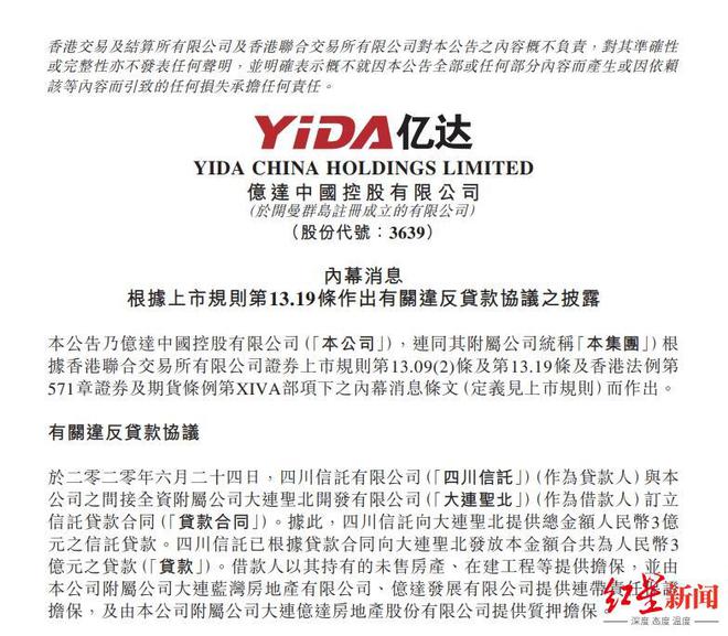 公告显示,2020年6月,四川信托与本公司之间接全资附属公司大连圣北开发有限公司(下称“大连圣北”)(作为借款人)订立信托贷款合同。据此,四川信托向大连圣北提供总金额人民币3亿元的信托贷款。大连圣北以其持有的未售房产、在建工程等提供担保,并由本公司附属公司大连蓝湾房地产有限公司、亿达发展有限公司提供连带责任保证担保,及由本公司附属公司大连亿达房地产股份有限公司提供质押担保。
