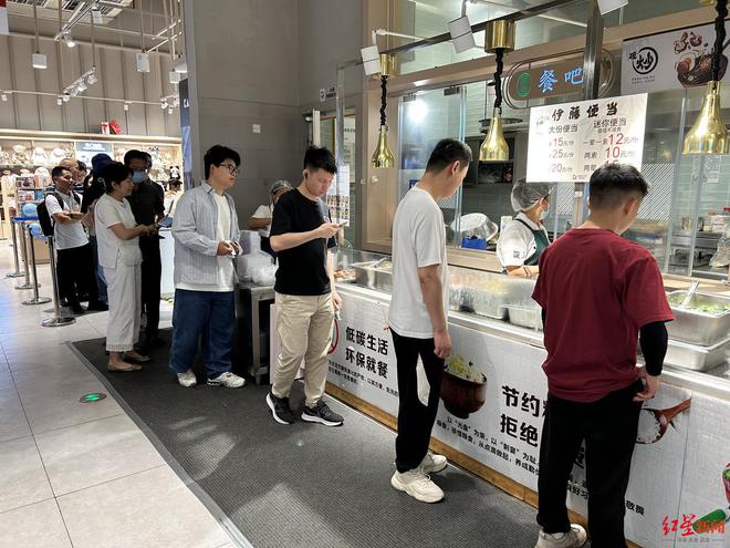 临近中午,周边的上班族陆续到来,店内人流较早上明显增多,其中餐吧人气最旺其中。餐吧售卖各类现炒小菜,盒饭套餐价格从10元到25元不等。微成都12点左右前往餐吧,前面已有近60人在排队点餐。