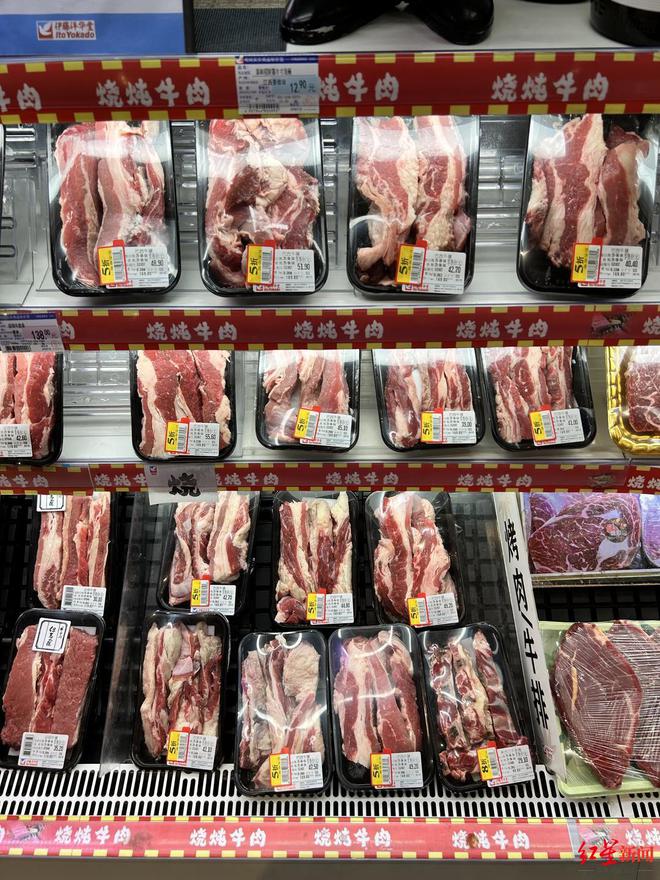 虽然探访时还未到年中庆时间,但是现场也有不少优惠活动。一位店员一边给牛肉贴上“5折”的优惠条一边招揽顾客,“买嘛,那么便宜”。