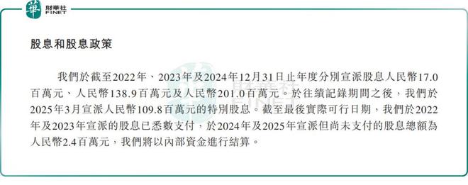 不过,2022年至2024年期间,圣桐特医分别宣派股息人民币0.17亿元、1.39亿元、2.01亿元。公司还于2025年3月宣派人民币约1.098亿元的特别股息。其中,2022年、2023年的股息已经悉数支付,于2024年、2025年宣派但尚未支付的股息总额为人民币240万元,将以内部资金进行结算。