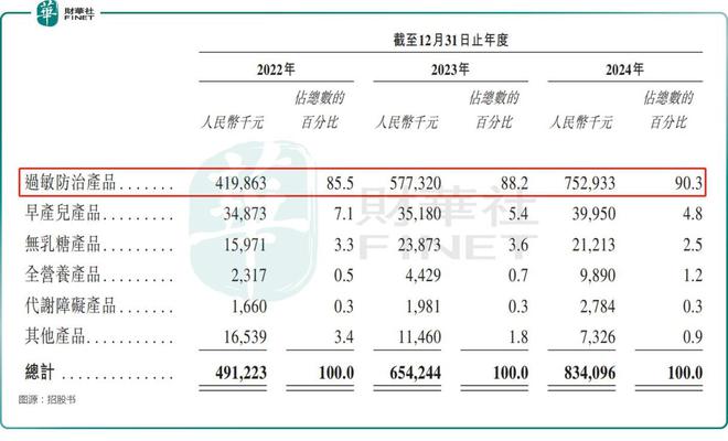 从产品结构来看,圣桐特医还存在过于依赖单一产品的情况。数据显示,过敏防治产品贡献了公司绝大部分收入,2022年、2023年及2024年分别占总收入的85.5%、88.2%和90.3%。这反映出公司存在对过敏防治产品的高度依赖,易受市场需求变动影响而引发业绩波动风险。