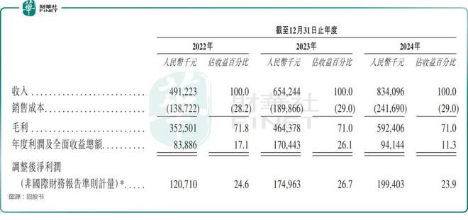业绩方面,2022年至2024年,圣桐特医的收入分别为4.91亿元(人民币,下同)、6.54亿元和8.34亿元,调整后净利润分别为1.21亿元、1.75亿元、1.99亿元;毛利率分别为71.8%、71.0%及71.0%。
