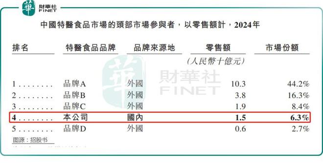 根据灼识咨询的资料,以2024年各品牌特医食品零售额计算,前五名企业合计占据78.0%的市场份额,市场集中度较高。其中,圣桐特医在中国特医食品市场中稳居本土特医食品品牌榜首,并在所有特医食品品牌中占据第四席位,市场份额为6.3%;圣桐特在中国婴儿特医食品市场中稳居本土特医食品品牌榜首,并在所有特医食品品牌中占据第三席位,市场份额为9.5%。