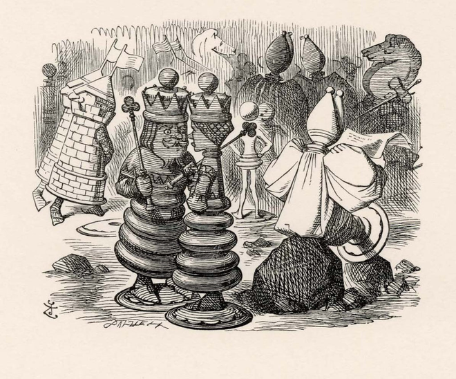 ▷在《爱丽丝镜中奇遇记》中的棋盘是一个巨大的、由田野、河流和森林构成的奇幻世界,整个镜中世界被设计成一个国际象棋棋盘,棋格由自然景观划分,棋子则是故事中的角色。爱丽丝作为白棋卒,从第二格开始,经历各种奇妙的冒险,最终到达第八格成为王后。这个棋盘不仅是一个游戏场景,还象征着爱丽丝的成长旅程和对规则的探索。插图:John Tenniel