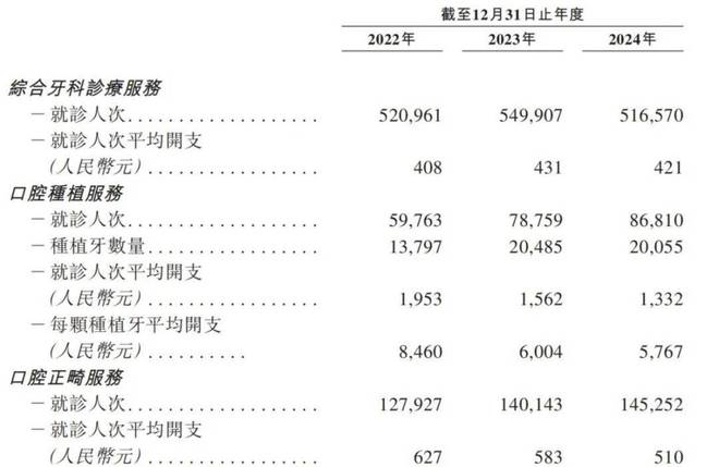 2022年至2024年,大众口腔服务的客户分别为27.63万人、29.69万人、28.36万人;客户就诊人次分别约70.87万次、76.88万次、74.86万次,就诊人次平均开支分别为578元、575元及544元。