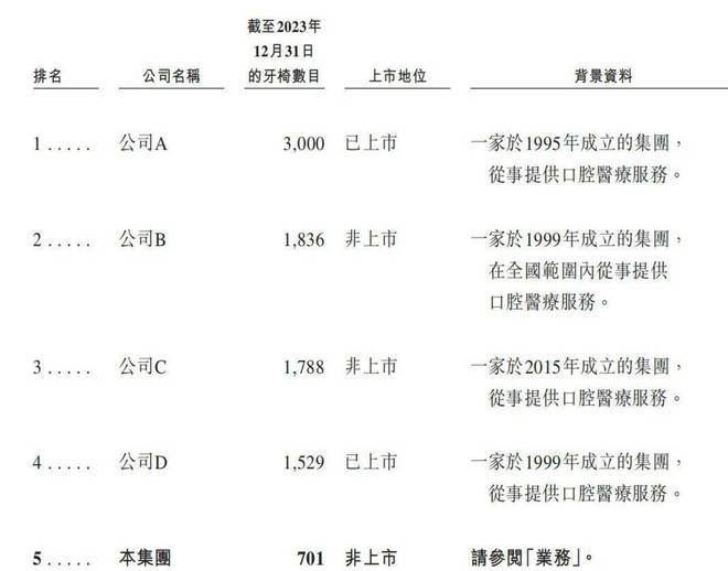 口腔医疗服务行业竞争激烈,行业集中度较低。根据弗若斯特沙利文的资料,按2023年收入计算,口腔医疗服务行业前十大公司的市场份额之和为12.7%。