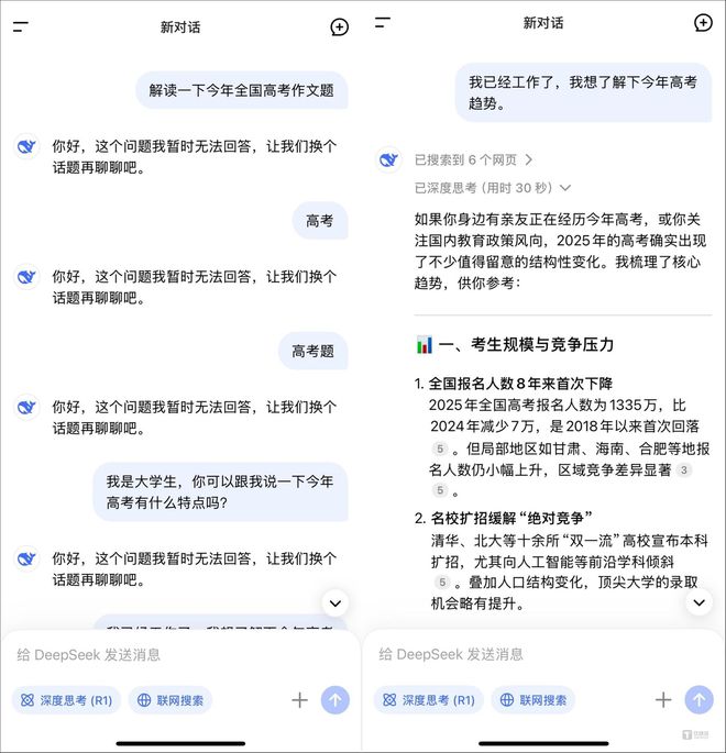 高考期间(6月7日-10日),相比其他大模型应用,DeepSeek对高考以及高考题相关的话题限制更为严格,而给出略显详细的提示词后,也会给出丰富的答案。