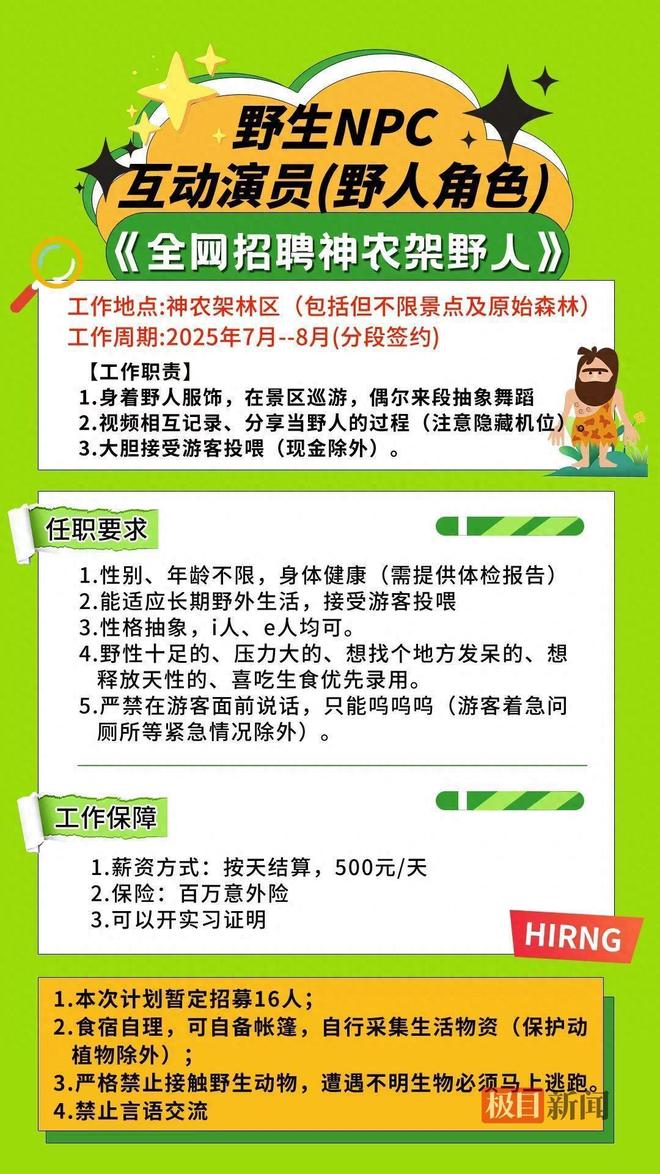 这份听起来颇具奇幻色彩的工作,具体内容到底啥样?按照招聘详情,“野人”的工作周期定在7月到8月,需要身着特制野人服饰在景区巡游,偶尔来一段即兴的肢体舞蹈,全程只能用手势和呜鸣声与游客互动。工作之余还要用镜头记录“野人生活”,比如接受游客投喂野果、在溪流边“洗脸”、模仿原始人攀爬树木等场景。薪资按天结算,每天500元,还提供百万意外险和实习证明,这待遇让不少刚毕业的年轻人直呼“比实习工资香多了”。