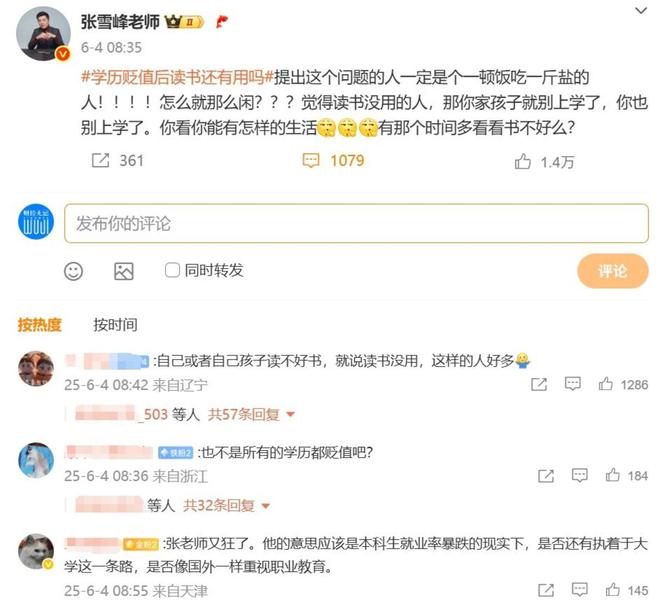 6月4日,面对热搜话题“学历贬值后读书还有用吗”,张雪峰在微博回复: