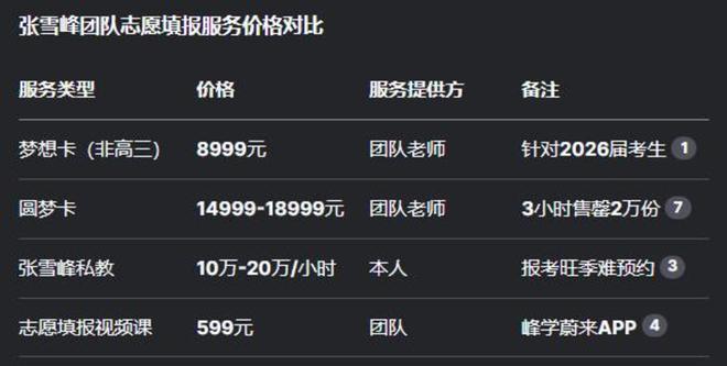 去年高考前两天,张雪峰公司开售高考志愿申报服务,既有针对高一的长远规划,也有针对高三应届生的加急服务,价格从九千到一万八不等。两万个名额不到三小时就被抢夺一空,有人算过,张老师这一波就进账两亿。