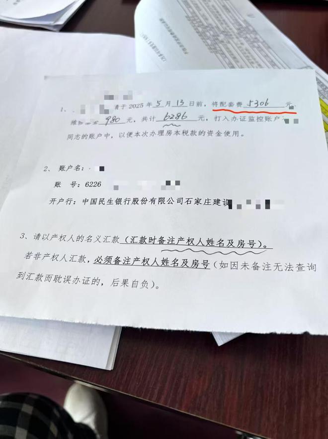 程女士说,业主们2025年5月终于盼来了好消息,街道办事处通知可以办证了,但之后被开发商石家庄金龙房地产开发公司告知需缴“配套费”,自己的房子要交5306元,而且是私人账户收款。面对业主质询,工作人员仅模糊回应是交“办房本的费用”,明确不交钱就无法办证。