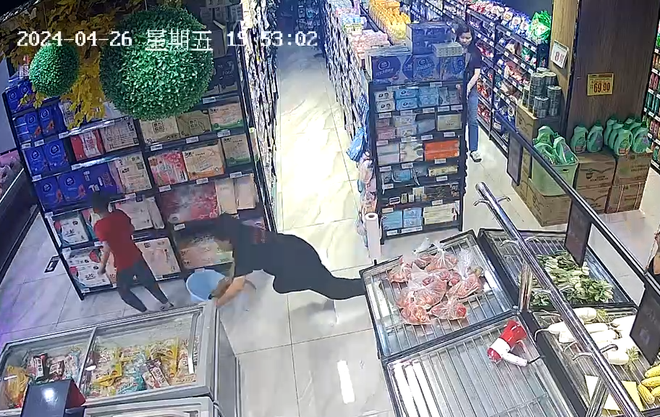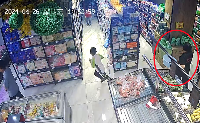 一段18秒监控视频显示:2024年4月26日晚上约7:50,超市货架上摆放着琳琅满目的商品,生鲜区则摆着辣椒、萝卜和藕等。一名身着黑色上衣的女营业员端着疑似有水的盆子从该区域向左拐,当她拐向左边后眼睛一直盯着左方。此时,一名身着红色T恤的小男孩与另一名小男孩在超市里奔跑追逐,当红衣小男孩从一通道拐角处转身往右跑时,女营业员刚好走到他身后,她突然摔倒在地面部朝下,手中盆子也摔了出去。