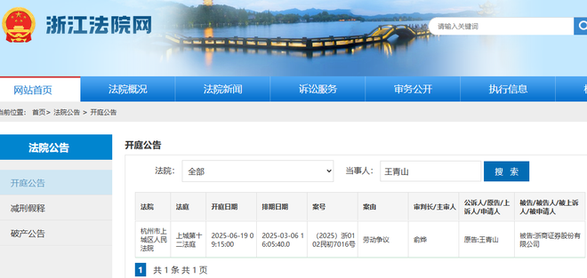 红星资本局6月17日消息,近日,浙江省杭州市上城区人民法院发布的一则开庭公告显示,原告王青山与被告浙商证券股份有限公司(下称“浙商证券”,601878.SH)劳动争议一案,将于6月19日开庭审理。