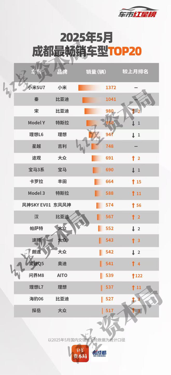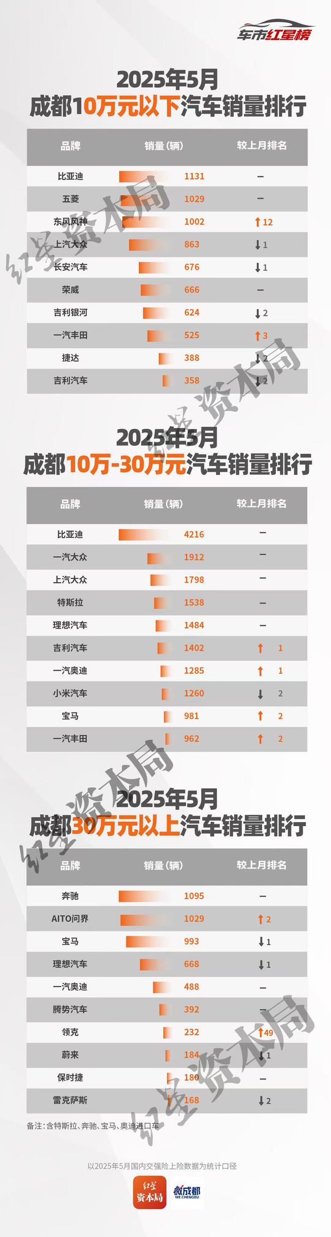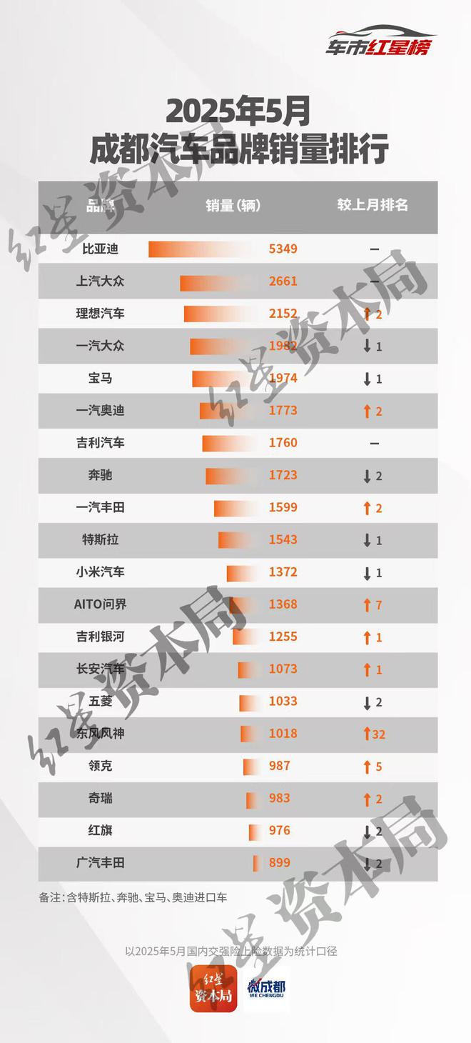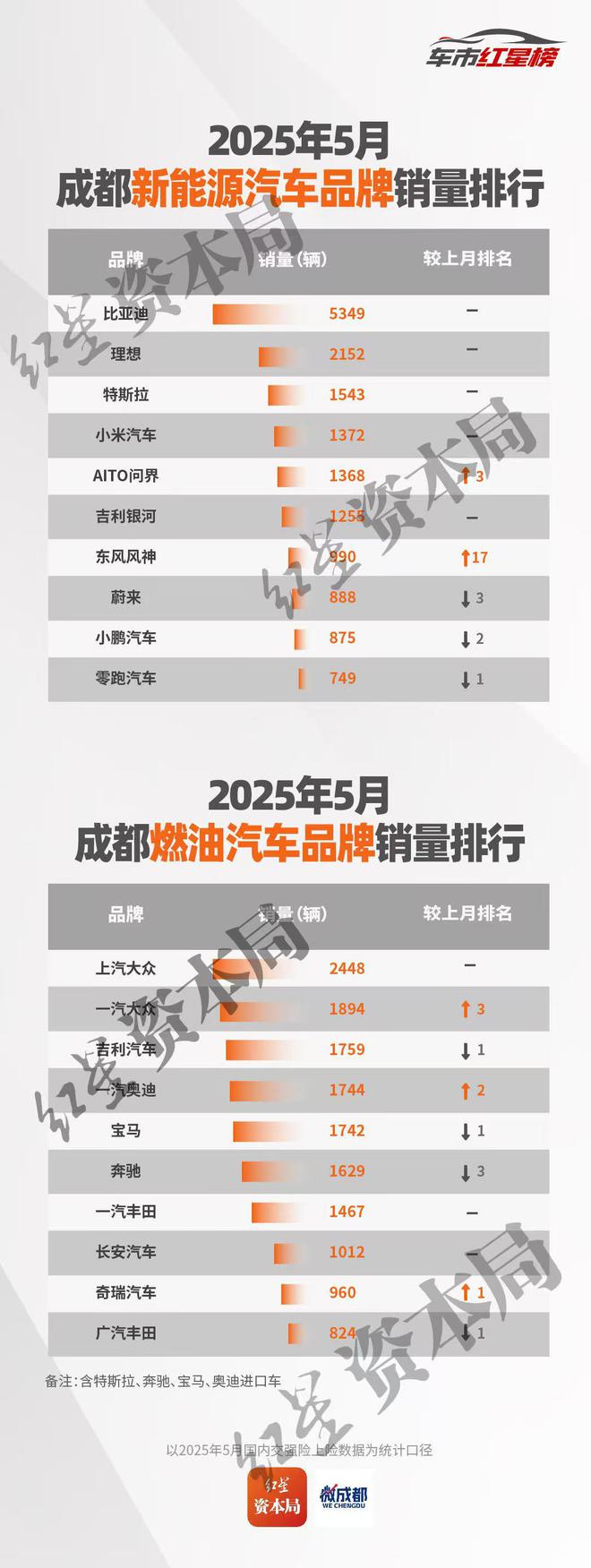 红星资本局6月16日消息,今日,红星资本局发布2025年5月中国(成都)车市红星榜。