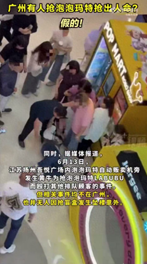 6月13日,一段聊天合集在微信群内传播,有人称“广州抢泡泡玛特摔死了一个”。同时,聊天合集内配发了有人在泡泡玛特售卖机前大打出手,及一女子倒在商场地上的画面。