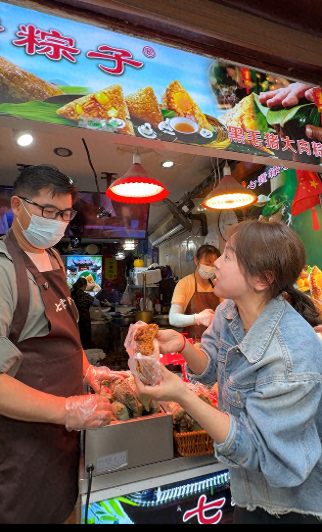 朱央的父母也是使用抖音消费的“新网民”。小时候,每逢开心的日子,他们带着朱央在街头寻觅美食,吃洪长兴的羊肉串、王家沙的青团、沈大成的粽子,为朱央留下最初的美食记忆。随后四十年,这片土地上的美食文化不断生长,成为市民生活的生动注脚。
