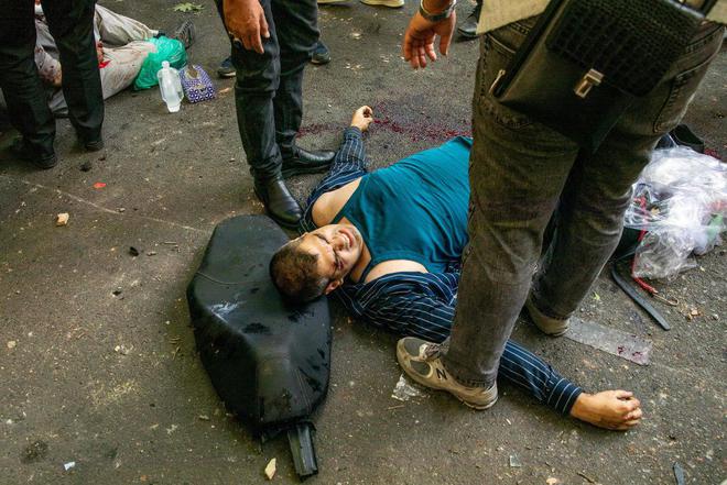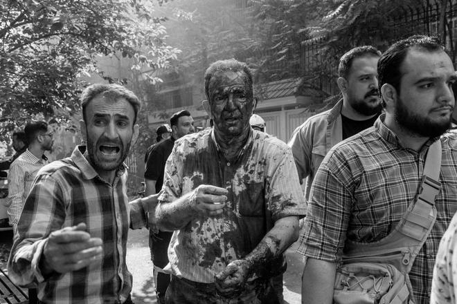 当地时间2025年6月15日,伊朗德黑兰市中心,凯沙瓦兹大道,一名男子在据称是以色列发动的袭击中受伤。(图片经黑白处理)
