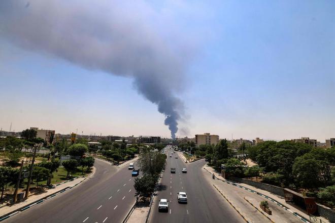 这是6月15日在伊朗首都德黑兰南部拍摄的市区景象,远处遭以色列袭击的储油设施升起浓烟。