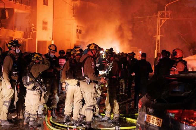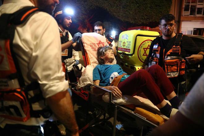 6月15日,在以色列特拉维夫南部巴特亚姆地区,救援人员转移伤员。