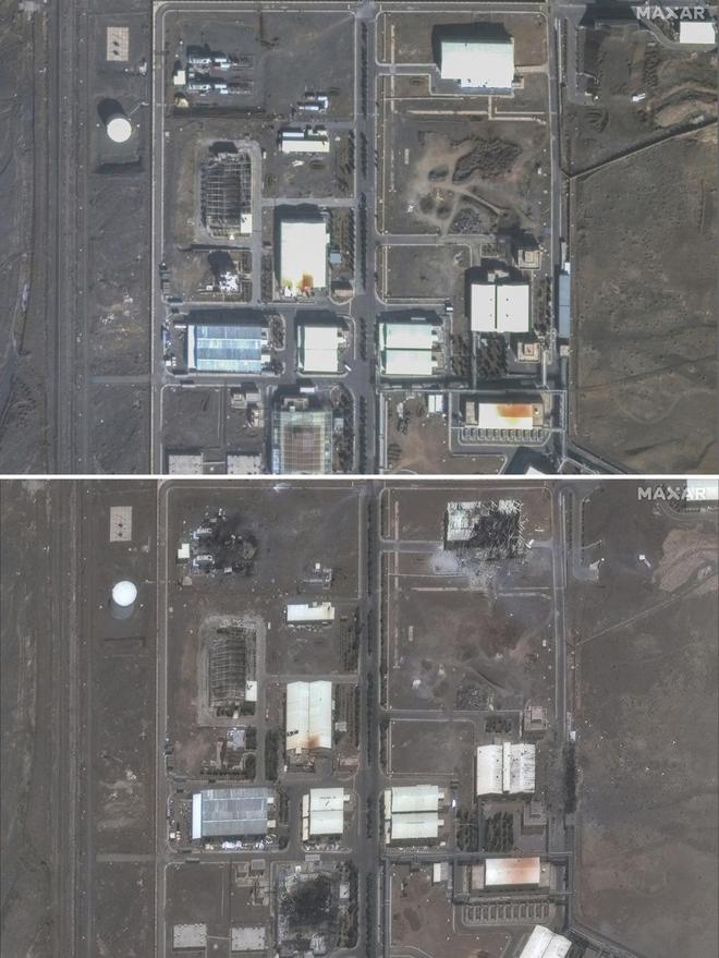 (上图)卫星图像显示,当地时间2025年1月24日,伊朗德黑兰东南135英里处的纳坦兹核浓缩设施。(下图)当地时间2025年6月14日,同一位置的多栋建筑在以色列的袭击中被摧毁。