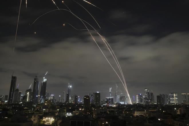 当地时间2025年6月15日,以色列特拉维夫,伊朗发动袭击期间,以色列“铁穹”防空系统发射导弹进行拦截。
