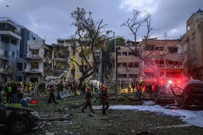 当地时间2025年6月16日,以色列特拉维夫市中心,救援人员和安全人员检查并清理被伊朗火箭弹击中的建筑物和区域。