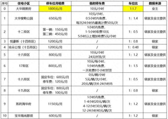 业主实地调研周边小区的车位配比及月租价格表