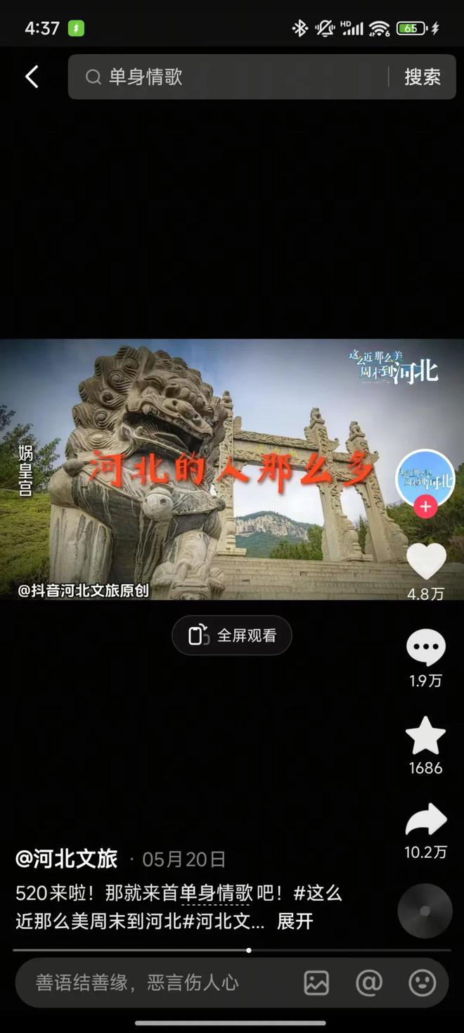 他们对热点的捕捉从未停止,前段时间在《歌手》热播期间,河北文旅官方抖音号又巧妙地改编了参赛歌手林志炫的代表作《单身情歌》的歌词,用以宣传河北旅游,其反应速度和创意能力可见一斑。