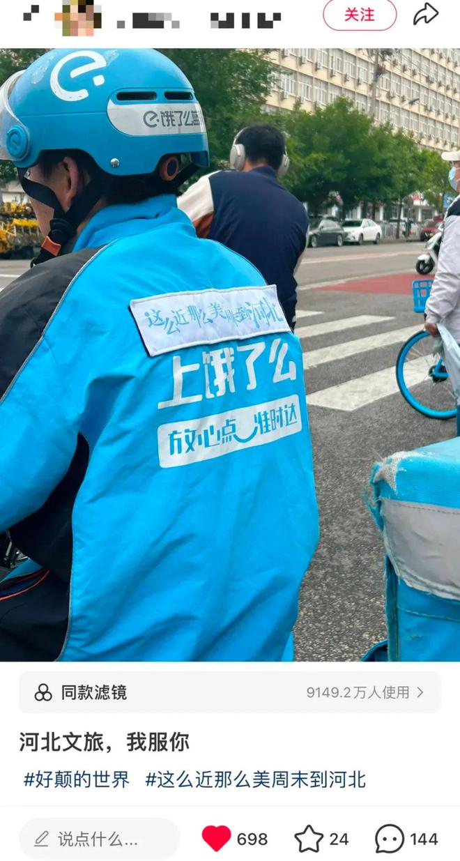 最绝的是,北京外卖骑手也身着印有口号的蓝色马甲穿街走巷,网友戏称:点个黄焖鸡都在被河北文旅监控。