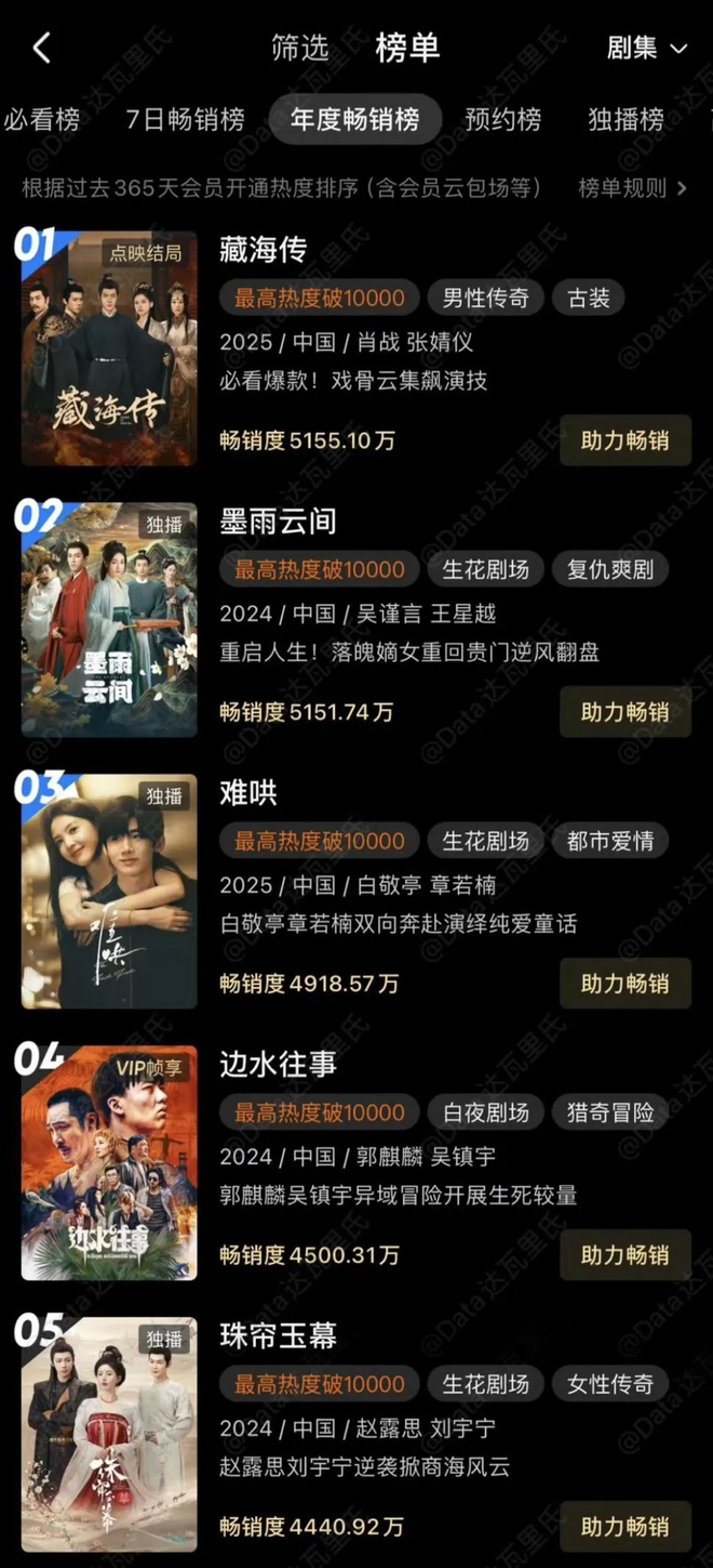 据豆瓣小组“收视率研究中心”统计,《藏海传》最终云包场座位累计突破43万份,收入超1200万元,断层刷新纪录,成为历史第一。