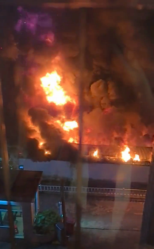 现场视频显示,小区的一排电动车棚火光熊熊,映照夜空,现场传出噼里啪啪的声响,以及电动车的警报声。