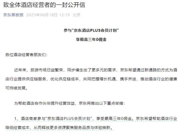 近日,刘强东又双叒叕登上热搜。6月18日,“京东黑板报”微信公众号发布《致全体酒店经营者的一封公开信》,宣布酒店商家参与“京东酒店PLUS会员计划”,可享最高三年0佣金。