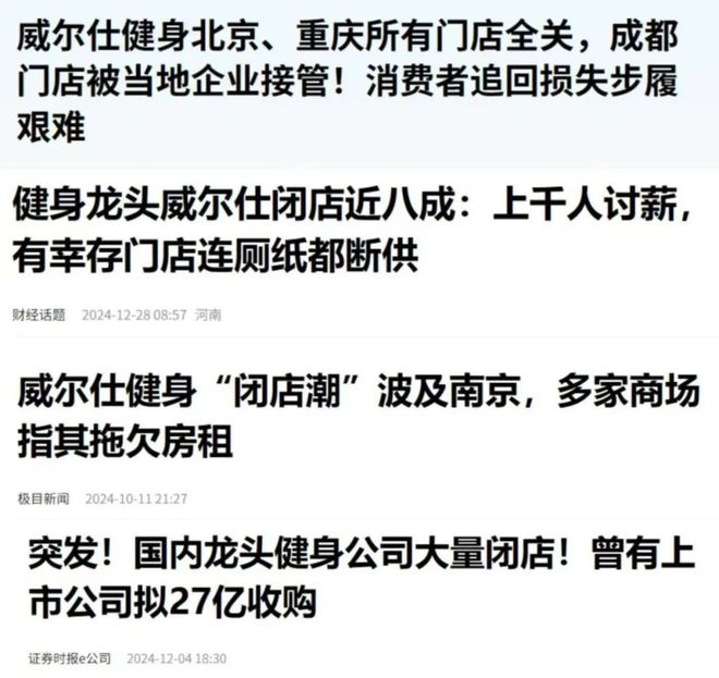 2024 年 12 月,威尔仕健身在公众号发布《威尔仕健身公告|致广大会员和合作伙伴》,称“公司在持续优化门店网络,合并了部分门店,是正常的、积极的经营调整,公司希望聚焦在更优势的门店服务好消费者。”