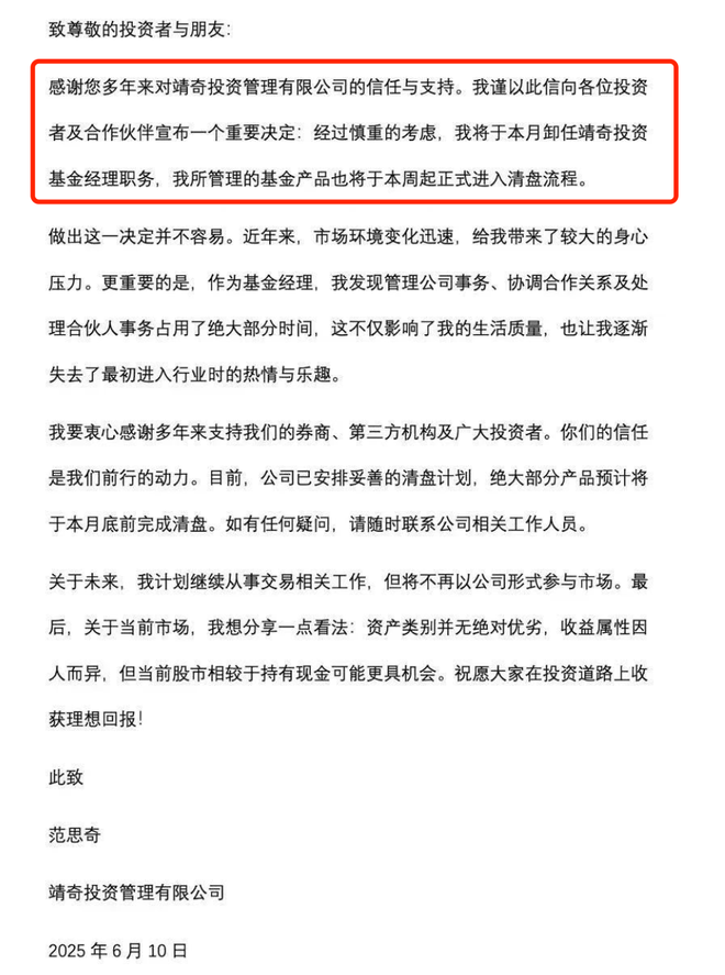 就在6月10日,范思奇在致投资者的信中表示,经过慎重考虑,将于本月卸任靖奇投资基金经理职务,他所管理的基金产品也将于本周起进入清盘流程。
