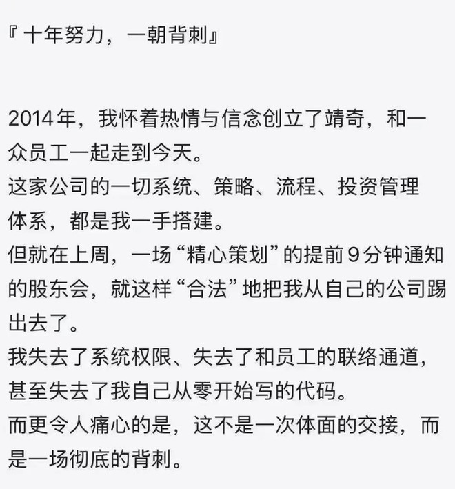 范思奇在文中表示,2014年,他怀着热情与信念创立了靖奇,和一众员工一起走到今天。这家公司的一切系统、策略、流程、投资管理体系,都是他一手搭建。但一场“精心策划”的提前9分钟通知的股东会,“合法”将他从公司踢出。