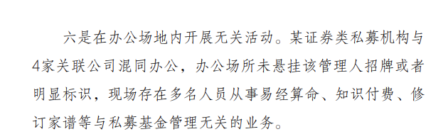 六是在办公场地内开展无关活动。某证券类私募机构与4家关联公司混同办公,办公场所未悬挂该管理人招牌或者明显标识,现场存在多名人员从事易经算命、知识付费、修订家谱等与私募基金管理无关的业务。