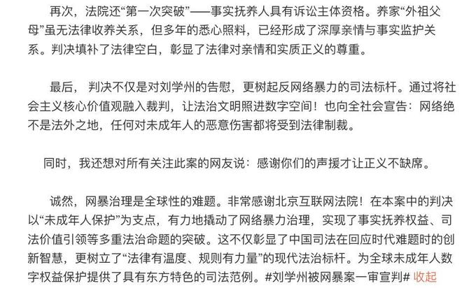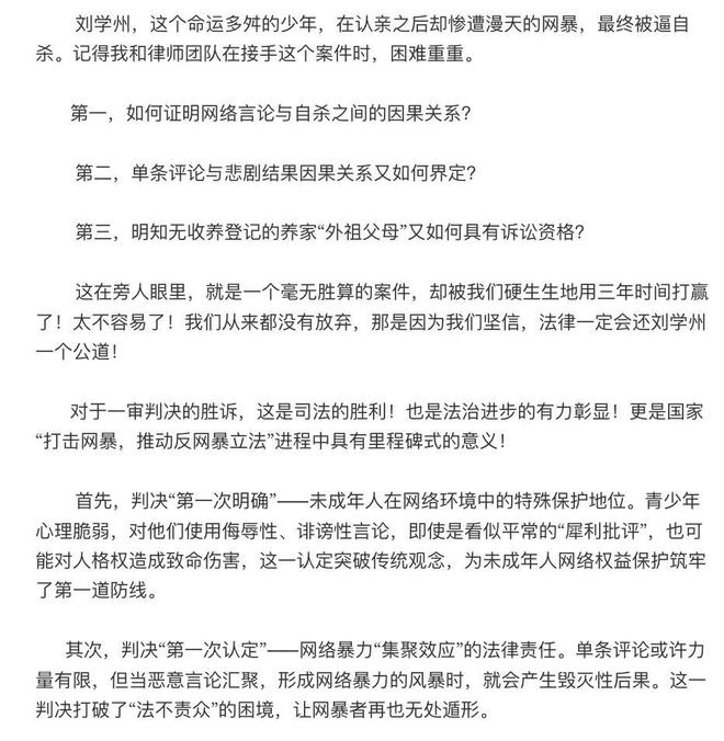 这场判决或许无法让少年重生,但至少让我们看到:网络世界不是法外之地,每句恶意的言论都该付出代价。而对所有网民来说,守住内心的善良和理性,不做谣言的传声筒,才是对这个年轻生命最好的告慰。毕竟,我们都不希望,下一个被网暴淹没的,是任何一个“刘学州”。