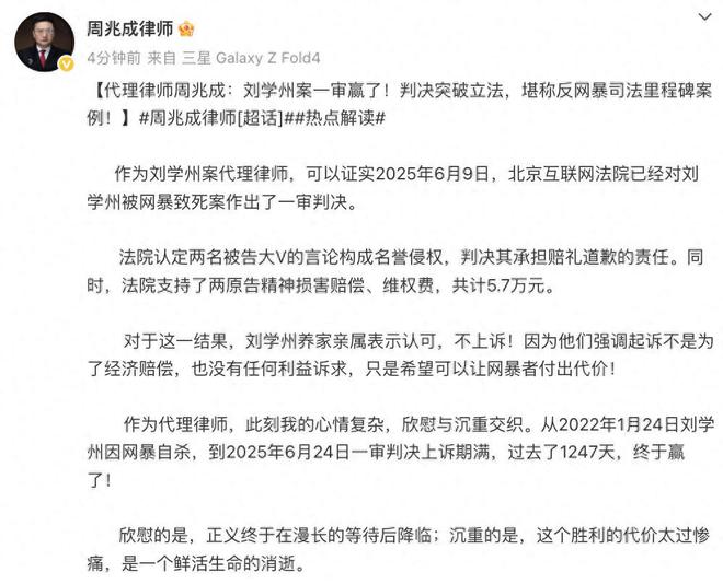 2025年6月24日,周兆成律师的一条微博像颗石子投进了平静的湖面。作为刘学州案的代理律师,他证实北京互联网法院在6月9日对这起网暴致死案作出一审判决:两名大V因言论构成名誉侵权,需公开赔礼道歉,并赔偿精神损害抚慰金与维权费共计5.7万元。消息传开时,很多人想起那个在三亚海边永远睡去的少年——2022年1月24日,17岁的刘学州在留下千字长文后结束了生命,而压垮他的,正是网络世界里那些带着恶意的尖刺。