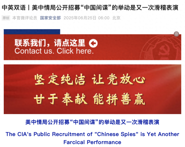 此前,CIA在网络上发布了两条在中国招募间谍的中文视频,引发网友的各种嘲讽。今天,“国家安全部”微信公众号发布中英双语文章,称美中情局此举是“又一次滑稽表演”。