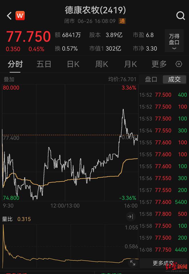 截至6月26日收盘,德康农牧股价报77.750港元,虽较高点有所回落,但与年初相比,涨幅仍超160%。