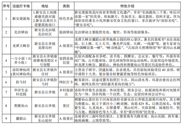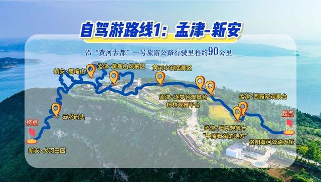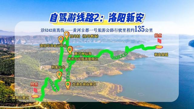 亮点及特色:新安烫面角—北冶驿站—龙潭大峡谷—打铁驿站—一方小居(石井小院)—洛阳神仙湾(黄河神仙湾)—拴马村—华洋生态科技园—荆紫仙山—黛眉山