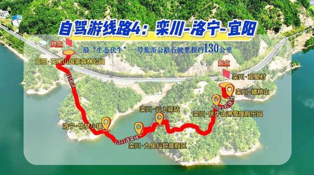线路路线:栾川县观星村—蟠桃山—伏牛山滑雪场—云上驿站—九尾仙踪度假区—洛宁全宝山(竹梦小镇)—宜阳县花果山