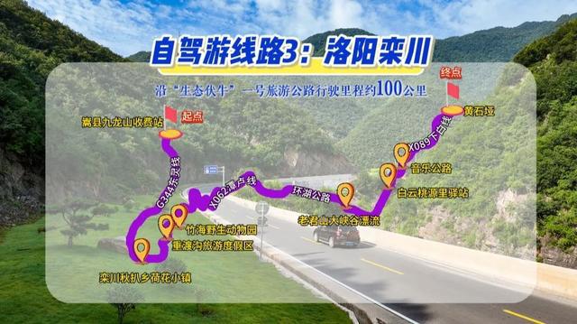 线路路线:洛阳市区——嵩县九龙山收费站下高速—栾川县潭头镇—拨云岭村—唐诗里文化村—鸭石村—重渡沟—铁路小镇—荷花小镇—栾川环湖路—白云桃源里驿站—音乐公路—涂鸦长廊—桃园村—黄石垭