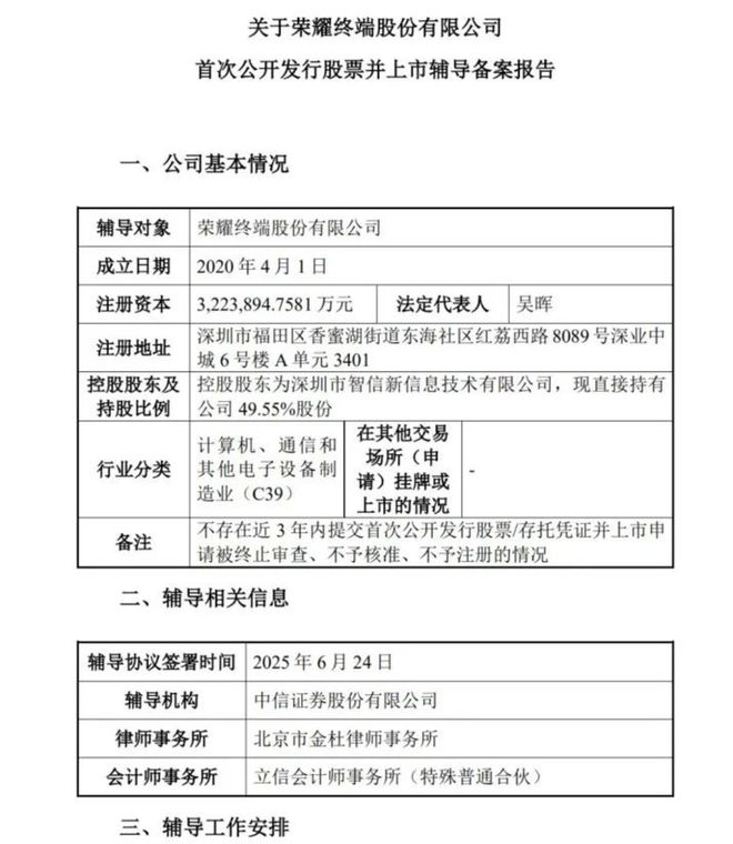 2025年6月26日,证监会官网披露荣耀已完成上市辅导备案,辅导券商选定为中信证券,计划于2026年1月至3月完成上市辅导工作。