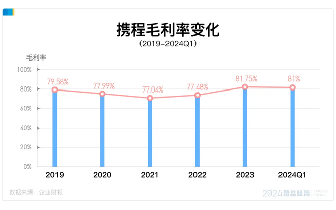 以携程为例:2024年,其净营收533亿元,同比增长20%;毛利润433.04亿,毛利率高达81%;净利润172亿元,净利率超32%。多年来,携程毛利率始终维持高位,2020年起未低于77%,远超腾讯、阿里等互联网巨头,更远高于京东。2024年,京东集团的毛利率约为15.3%。