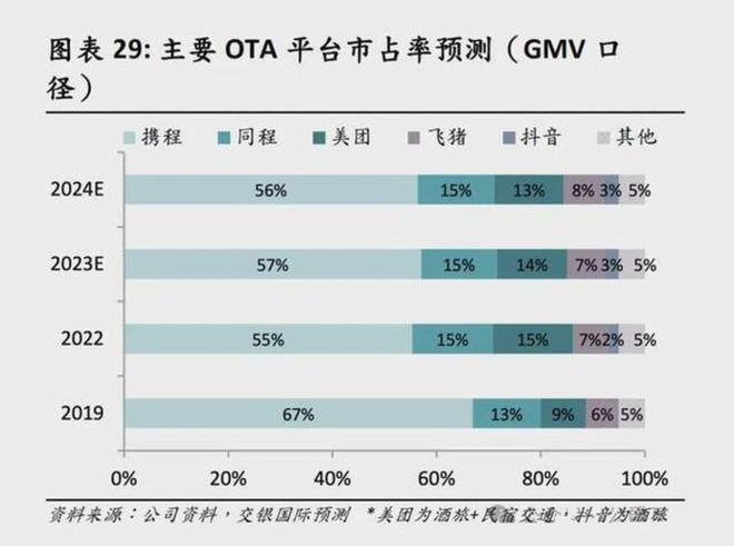 两大电商巨头的加码,无疑将为火热的酒旅竞争再添一把火。交银国际研报预测,2024年,以GMV计算,携程在OTA领域的市占率为56%,大幅领先;同程旅行排名第二,占15%;美团酒旅占13%、飞猪8%、抖音为3%,其他玩家共占剩余的5%。