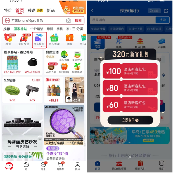 目前,京东App首页已上线“京东旅行”入口,并向新用户提供100元、80元、60元不等的满减红包。从业务模式,到商家招募;从人员架构,再到用户补贴,京东酒旅业务已整装待备。