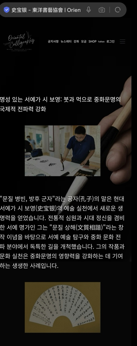 29日,“韩国东洋书艺协会”官网刊文详介著名书法家史宝银,这是继几天前(21日)史宝银书法作品《墨香琴韵》联在韩国首尔举行的“第22回·大韩民国东洋书艺大展暨第22回·中韩书艺招待作家展”展出后的活动。