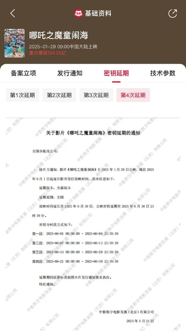 据了解,哪吒2密钥延期四次,上映时长153天,目前位列全球票房第五位。